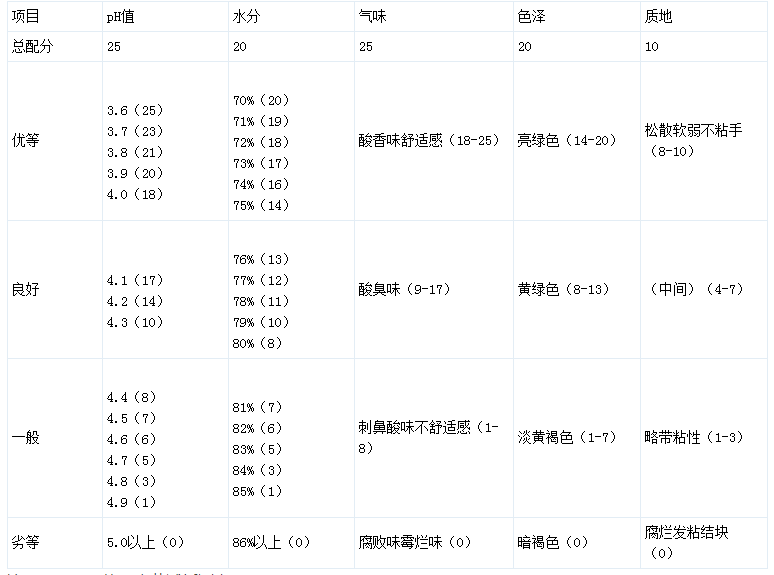 用農(nóng)富康秸稈發(fā)酵劑制作青貯飼料可將青貯飼料水分、感官指標(biāo)和pH值加以綜合、量化,以便于科學(xué)、簡(jiǎn)便地評(píng)定青貯飼料質(zhì)量。各大宗青貯飼料的評(píng)分表如下附表。